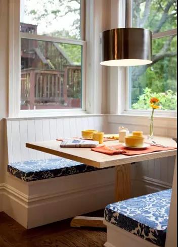 這種卡座靠墻而設(shè),最為常見。有點(diǎn)類似飄窗,