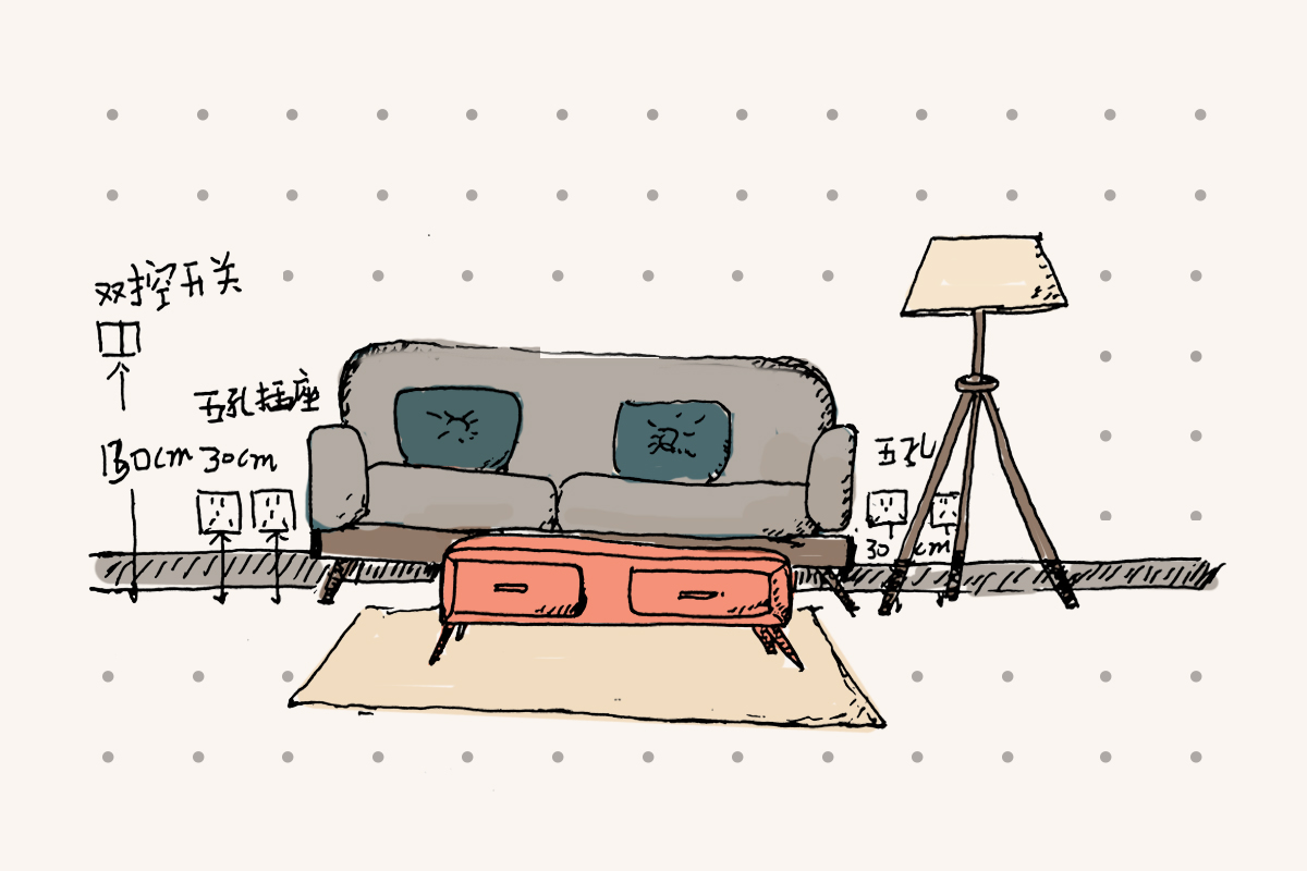 沙發(fā)兩側(cè)可以各留出2個(gè)五孔插座,高度離地面