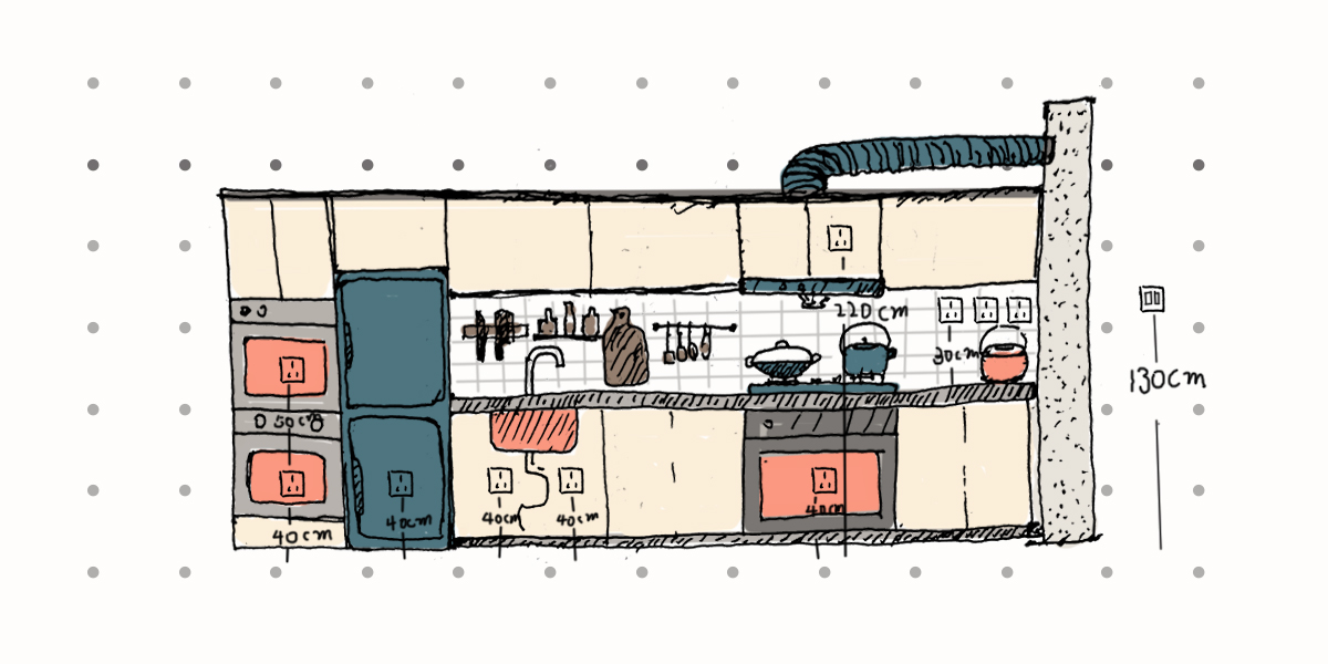 櫥柜臺(tái)面以上需要安裝3個(gè)帶開關(guān)的插座,高度是在臺(tái)面上方